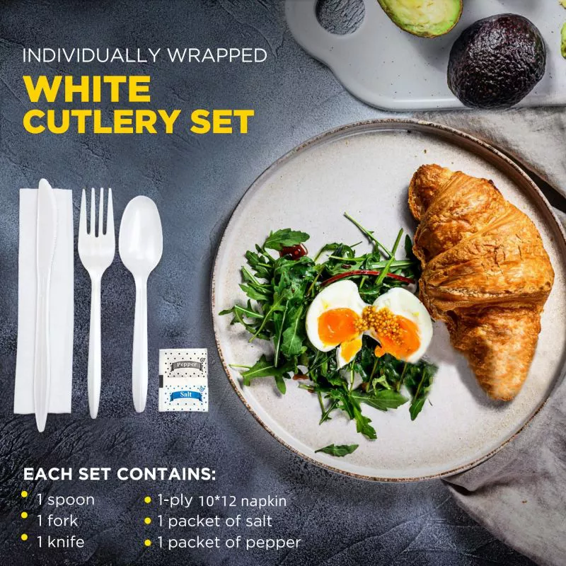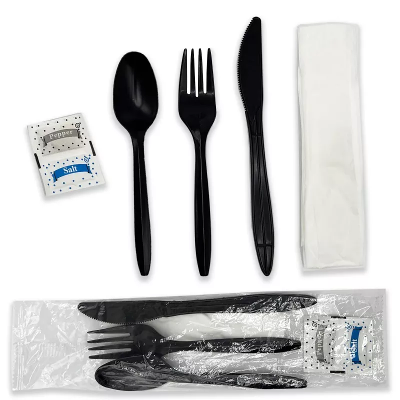 SY-PPC01 Medium Weight Wrapped PP Cutlery KITS (Fork, Spoon, Knife, Napkin),White/Black, 250ct.